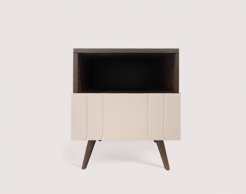 Grant Bedside Cabinet is a stylish and functional piece of furniture designed to enhance your bedroom decor. This bedside table features a rich wenge finish and a unique touch - a light cream-coloured drawer with grooves on the front-facing surface.
