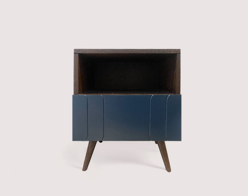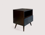 Grant Bedside Cabinet is a stylish and functional piece of furniture designed to elevate your bedroom decor. This bedside table features a rich wenge finish and a unique touch - a navy-coloured drawer with grooves on the front-facing surface.