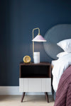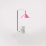 The Marco Table Lamp exhibits pure geometry with its clean line structure and angular profile. The cone-shaped pink shade is expertly attached to the gold finish arm connected with a heavy white cylindrical marble base.