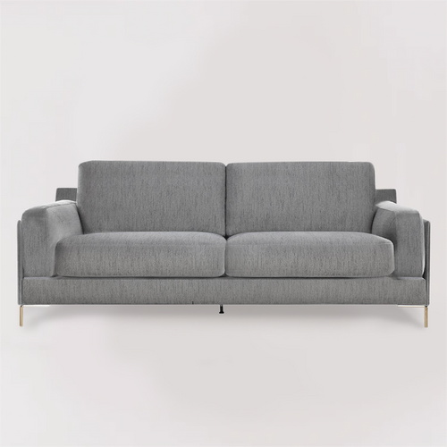 An exquisitely modern sofa with gold legs and grey woven fabric suited to both classic and contemporary interiors, offering unmistakable style and elegance.